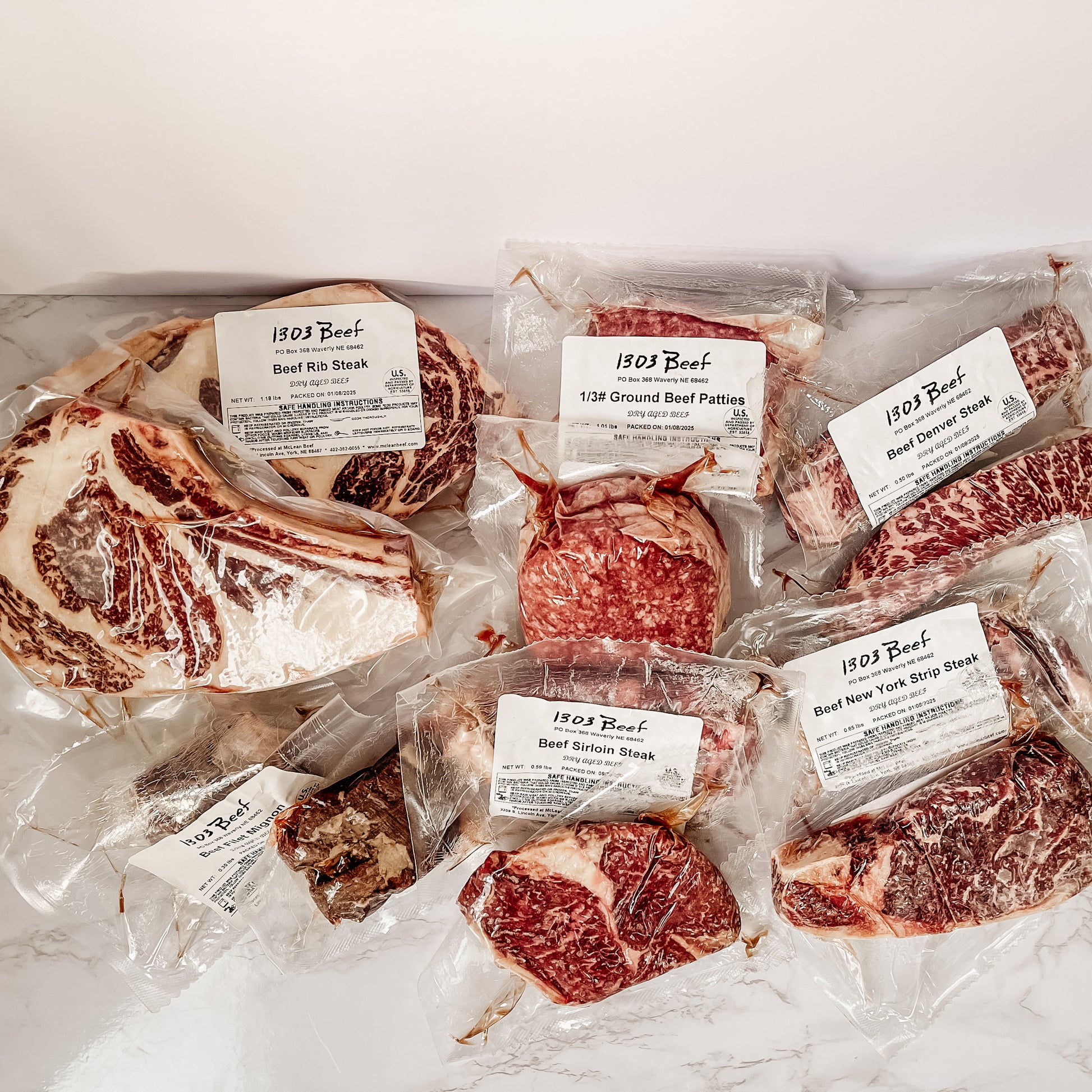 Experience the taste of the Midwest with our high-quality Nebraska born and raised beef. Each box includes 2-Ribeye, 2-New York Strips, 2-Filet Mignon, 2-Sirloins, 2-Denver Steaks, and 2-1lb packages of burger patties.